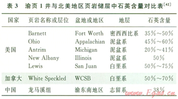 渝東南地區(qū)下志留統(tǒng)龍馬溪組頁巖中的石英含量與美國已開發(fā)頁巖儲(chǔ)層中的石英含量相當(dāng)(表3),渝東南地區(qū)龍馬溪組頁巖中石英的平均含量為38%,表明該區(qū)頁巖氣儲(chǔ)層多具有良好的可壓裂性。