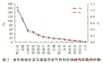 有利區(qū)塊找氣絕對(duì)優(yōu)度和找氣相對(duì)優(yōu)度計(jì)算結(jié)果如表3所示。根據(jù)頁巖氣有利度圈定的渝東南地區(qū)黔江西、黔江東、武隆、連湖西、連湖中、連湖東、太極西、彭水高谷、彭水長灘、彭水鹿角西、彭水鹿角東、酉陽西、酉陽東和大有l4個(gè)龍馬溪組頁巖氣有利區(qū)塊中,根據(jù)找氣絕對(duì)優(yōu)度及相對(duì)優(yōu)度,排在前6位的區(qū)塊依次為黔江西、武隆、太極西、連湖東、連湖西、連湖中(表4、圖3)。