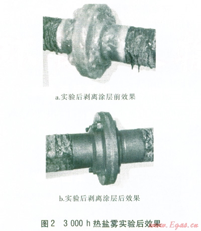 Enviropeel系統(tǒng)符合美國標(biāo)準(zhǔn)ASTMBll7《熱鹽霧實(shí)驗(yàn)》。圖2為在該標(biāo)準(zhǔn)下測試3 000 h之后的法蘭表面效果。實(shí)驗(yàn)表明,Enviropeel系統(tǒng)對(duì)其覆蓋范圍內(nèi)的金屬具有良好的防腐效果,而在沒有Enviropeel涂層保護(hù)的地方,如法蘭兩側(cè)連接處,則腐蝕非常嚴(yán)鶯。
