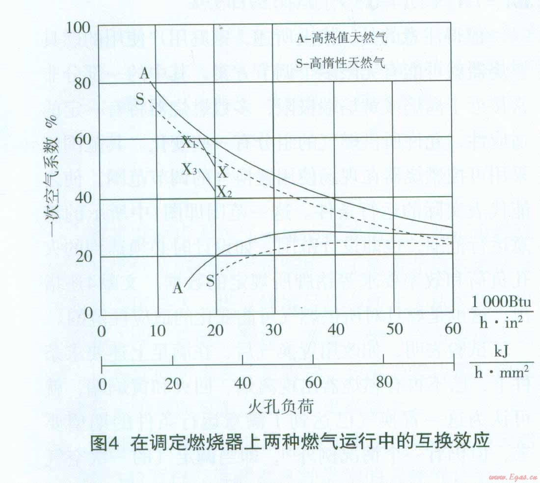 這說明用高熱值天然氣調(diào)定后的燃燒器在改用高惰性天然氣置換后,其運(yùn)行工作點(diǎn)x。已高于高惰性天然氣的離焰極限曲線值(見圖4中X1的位置),會(huì)發(fā)生離焰。顯然,如調(diào)定點(diǎn)x置于調(diào)定氣的極限曲線上(一次空氣系數(shù)接近60%一見圖4),則置換后的工作點(diǎn)X1將遠(yuǎn)高于置換氣的離焰曲線(圖上未表示),這一運(yùn)行工況是完全不能接受的。在這一特殊的假設(shè)條件下,如燃燒器的調(diào)定是在同樣的火孔負(fù)荷下,但一次空氣系數(shù)略低于50%(約為42%,其工作點(diǎn)在圖4上用X1表示,則在用高惰性天然氣置換后,一次空氣百分?jǐn)?shù)增加到PAx3=PAX2×1.1744=0.42×1.1744=0.4932即49.30%
