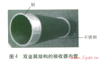 由于接收器的工作壓力高達(dá)l0 MPa,綜合考慮成本、效率、安全等因素,通常采用不銹鋼管作為內(nèi)管,但不銹鋼的熱導(dǎo)率較低,僅為15~18 W/(m·K),而銅可達(dá)450 W/(m·K),這易造成接收器周向熱流量和汽液分布不均,甚至發(fā)生彎曲變形,最終導(dǎo)致玻璃外套管破裂、接收器偏離聚焦線。為了解決這一問(wèn)題,V.Flores等人[8]提出了一種雙金屬結(jié)構(gòu)的接收器內(nèi)管(見(jiàn)圖4),內(nèi)層采用具有高熱導(dǎo)率的銅以減小管內(nèi)傳熱的周向溫差,外層采用不銹鋼以保證內(nèi)管的工作強(qiáng)度,研究發(fā)現(xiàn)雙金屬結(jié)構(gòu)的內(nèi)管周向溫差較不銹鋼內(nèi)管顯著減小。W.Spirkl等人[9]在聚光集熱器中加入二次反射板,將聚光器匯聚的一部分太陽(yáng)光反射到接收器的另一側(cè)。加入二次反射板后,接收器周向接收的太陽(yáng)能較均勻,但增加了太陽(yáng)光的反射次數(shù),降低了光效率。