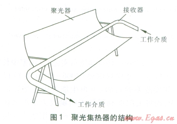 槽式太陽(yáng)能發(fā)電系統(tǒng)將多個(gè)槽型拋物面聚光集熱器經(jīng)過(guò)串并聯(lián)的排列,收集較高溫度的熱能,加熱工作介質(zhì),產(chǎn)生蒸汽,驅(qū)動(dòng)汽輪發(fā)電機(jī)組發(fā)電。系統(tǒng)包括:聚光集熱器(由聚光器、接收器組成)、換熱系統(tǒng)、工作介質(zhì)循環(huán)動(dòng)力設(shè)備、汽輪發(fā)電機(jī)等。聚光集熱器的結(jié)構(gòu)見(jiàn)圖1。聚光器采用拋物面形,將太陽(yáng)光反射匯聚到接收器上。接收器由表面鍍有太陽(yáng)選擇性膜層的鋼管(內(nèi)管)及玻璃外套管組成,二者之間的空間為真空,以減少傳熱損失。