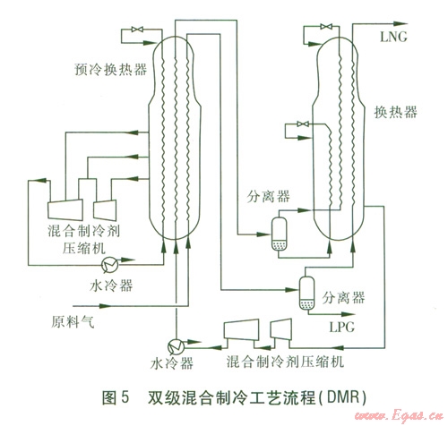 ③雙級(jí)混合制冷工藝(簡(jiǎn)稱(chēng)DMR)。采用乙烷、丙烷與少量甲烷、丁烷混合物為預(yù)冷流程制冷劑,將天然氣從常溫預(yù)冷到