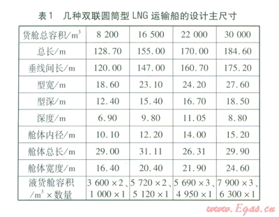 國內(nèi)外雙聯(lián)圓筒型LNG運(yùn)輸船的設(shè)計(jì)主尺寸[15-16]見表l,支線LNG船的液貨艙尺寸即為表l中容積22