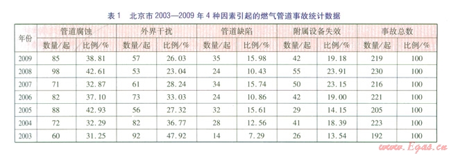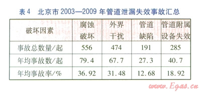 由表l可知,引起北京城市燃?xì)夤艿佬孤┑脑蛑?,管道腐蝕和外界干擾引起的管道事故所占比例較高,兩者之和超過事故總數(shù)的68%,即管道腐蝕和外界干擾是管道失效的主要原因。此外,從2003年至2009年,外界干擾引起管道失效的比例有明顯下降,而管道附屬設(shè)備失效引起的事故比例有所上升,說明近年來燃?xì)夤艿榔髽I(yè)對于管道的管理力度有所加大,社會及施工單位對燃?xì)夤艿赖陌踩庾R有所加強(qiáng)。而燃?xì)夤艿栏綄僭O(shè)備由于種類多、數(shù)量大、分布散等特點(diǎn),檢測相對復(fù)雜,因此容易被管道巡線檢查所忽視,其逐年升高的泄漏失效率應(yīng)在風(fēng)險(xiǎn)評價(jià)中引起足夠的重視。
