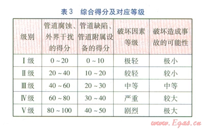 分別對上述各項(xiàng)進(jìn)行專家評分,在確定各項(xiàng)的得分后,將得分相加得出各項(xiàng)破壞因素的綜合評分,按照表3確定各項(xiàng)破壞因素評估的等級。得分越高,管道可能遭受此種因素破壞的等級越高,管道的綜合安全狀況也越差。