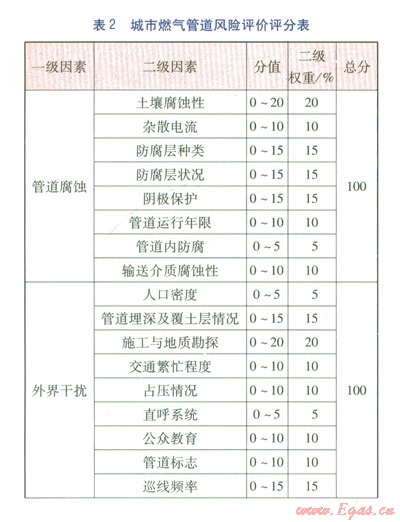 燃?xì)夤艿赖娘L(fēng)險(xiǎn)評價(jià)方法通常以W.Kent Muhlbaue提出的風(fēng)險(xiǎn)評價(jià)模型(評分法)為依據(jù),在W.Kent Muhlbaue所著的《管道風(fēng)險(xiǎn)管理手冊》中確定的4類評分指標(biāo)分別是第三方指數(shù)、腐蝕指數(shù)、設(shè)計(jì)指數(shù)、誤操作指數(shù)[3],對長輸油氣管道有很強(qiáng)的針對性,不一定完全適用于城市埋地燃?xì)夤艿?。在本文評分指標(biāo)體系的構(gòu)建中,將把文獻(xiàn)[3]評分法中不相關(guān)、不適應(yīng)的指標(biāo)予以剔除,根據(jù)城鎮(zhèn)燃?xì)夤艿赖奶攸c(diǎn)對指標(biāo)重新分類,并進(jìn)行適當(dāng)調(diào)整和補(bǔ)充,確定4大評分指數(shù),分別為腐蝕指數(shù)、外界干擾指數(shù)、管道缺陷指數(shù)、管道附屬設(shè)備失效指數(shù)。城市燃?xì)夤艿里L(fēng)險(xiǎn)評價(jià)評分表見表2。