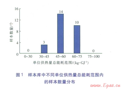 樣本庫(kù)中不同單位供熱量總能耗范圍內(nèi)的樣本數(shù)量分布見(jiàn)圖l