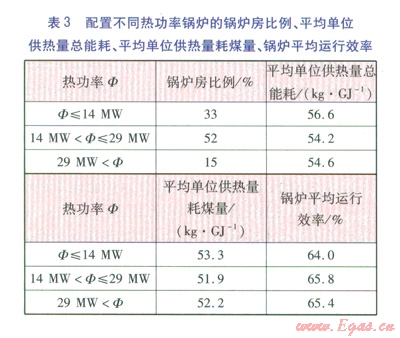 在對(duì)這27座鍋爐房進(jìn)一步的現(xiàn)場(chǎng)調(diào)查中發(fā)現(xiàn),配置不同熱功率鍋爐的鍋爐房能效指標(biāo)和鍋爐運(yùn)行效率不同。配置不同熱功率鍋爐的鍋爐房比例、平均單位供熱量總能耗、平均單位供熱量耗煤量、鍋爐平均運(yùn)行效率見(jiàn)表3。對(duì)于這27座鍋爐房,配置熱功率大于l4 MW且小于等于29 MW鍋爐的鍋爐房數(shù)量最多,鍋爐平均運(yùn)行效率也最高;配置熱功率大于29 MW鍋爐的鍋爐房數(shù)量最少,鍋爐平均運(yùn)行效率居中;配置熱功率小于等于14 MW鍋爐的鍋爐房數(shù)量居中且大多分布在中心城區(qū)以外,鍋爐平均運(yùn)行效率最低。
