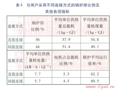 現(xiàn)場(chǎng)調(diào)查時(shí)發(fā)現(xiàn):當(dāng)鍋爐房與熱用戶(hù)采用直接連接方式時(shí),平均單位供熱量耗電量較高,主要原因是動(dòng)力設(shè)備耗電量較大。當(dāng)采用間接連接方式時(shí),平均單位供熱量耗電量較低,主要原因是動(dòng)力設(shè)備耗電量較少。與用戶(hù)采用不同連接方式的鍋爐房比例及其他各項(xiàng)指標(biāo)見(jiàn)表4