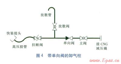 在卸氣柱卸氣過程中,由于工作人員的疏忽,在更換第二輛CNG氣瓶車時(shí),誤操作將第一輛和第二輛CNG氣瓶車所連接的卸氣柱主閥同時(shí)打開。這時(shí)就會(huì)造成第二輛車內(nèi)的CNG反充入第一輛車(尤其是CNG減壓橇流量不大的時(shí)候),使得第一輛車內(nèi)的余氣量增加,影響正常運(yùn)營。為了防止工作人員誤操作所帶來的問題,可以在卸氣柱主閥的前面增加一個(gè)單向閥。帶單向閥的卸氣柱見圖4。