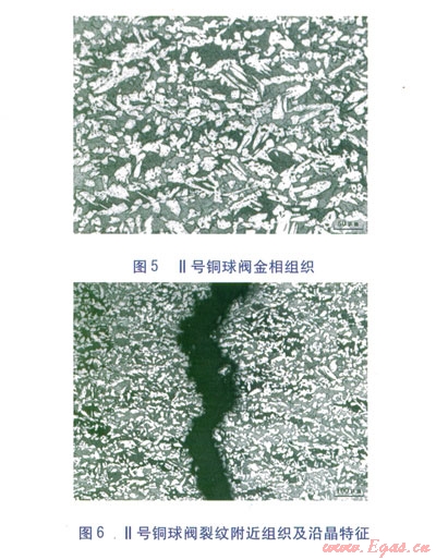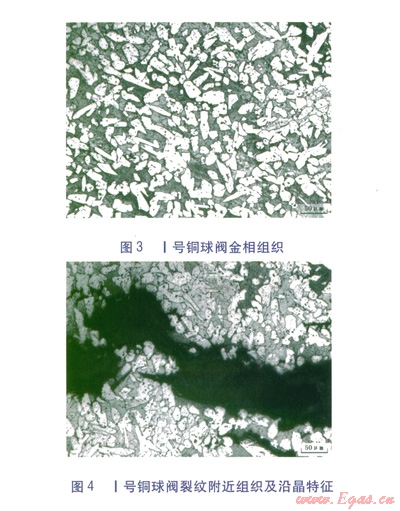 I號、號銅球閥的金相組織[1]及裂紋進(jìn)行分析,結(jié)果如下: