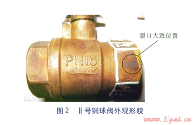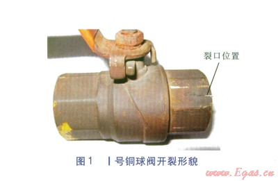 近年來,在西安秦華天然氣有限公司天然氣輸配系統(tǒng)中螺紋銅球閥與燃?xì)夤艿缆菁y連接處開裂事件屢有發(fā)生,據(jù)統(tǒng)計(jì)2011年中壓閥門井內(nèi)的放散銅球閥(DN 25 mm)及調(diào)壓箱進(jìn)口管道處設(shè)置的放散銅球閥(DN 25 mm)發(fā)生螺紋連接處開裂事件43起,嚴(yán)重影響了天然氣輸配系統(tǒng)的安全可靠性。為了查明銅球閥與燃?xì)夤艿缆菁y連接處開裂的原因,我們將開裂的銅球閥樣件送交專業(yè)管材研究部門進(jìn)行分析鑒定,并對燃?xì)庀到y(tǒng)中銅球閥的應(yīng)用環(huán)境進(jìn)行全面的調(diào)研分析。