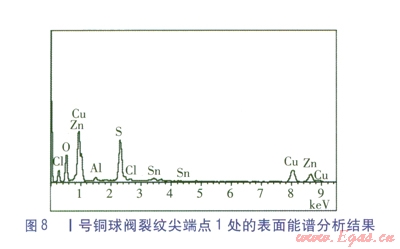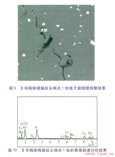 號銅球閥裂口尖端處的灰色物質(zhì)試樣進(jìn)行掃描電子顯微鏡觀察,結(jié)果表明:裂紋表面可見明顯灰色覆蓋物。能譜分析結(jié)果表明主要成分為Cu、Zn、SO和少量Cr、Mn等,號銅球閥裂紋尖端點(diǎn)l處的電子顯微鏡觀察結(jié)果和表面能譜分析結(jié)果見圖9、10。