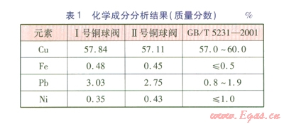 分別對Ⅰ號、號銅球閥閥體的化學(xué)成分進(jìn)行檢測分析,分析結(jié)果見表1。