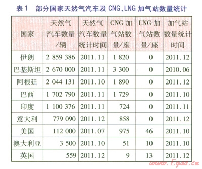 由表l可以看出,伊朗、巴基斯坦、阿根廷、巴西、印度和意大利等幾個(gè)國(guó)家的天然氣汽車擁有量接近世界天然氣汽車總量的80%,且全部采用CNG汽車。通過(guò)表lCNG加氣站與LNG加氣站數(shù)量對(duì)比,可以判斷,世界范圍內(nèi)LNG汽車數(shù)量遠(yuǎn)遠(yuǎn)小于CNG汽車數(shù)量,車用LNG處于起步階段。