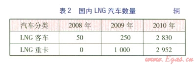 截至2010年,國(guó)內(nèi)有近6 000LNG汽車,推廣使用LNG汽車的城市主要有北京、貴陽(yáng)、長(zhǎng)沙、烏魯木齊等,均以LNG公交車為主。表2為近幾年來(lái)我國(guó)LNG汽車的發(fā)展情況[6]