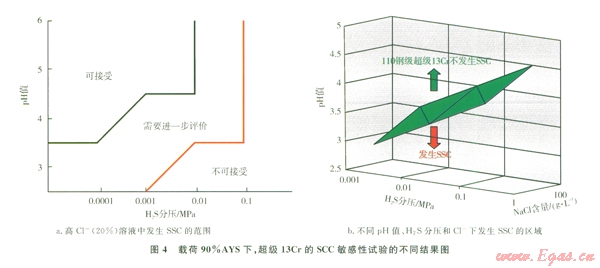 Cooling等人[10-11]通過按照NACE TM0177標準恒載荷、SSRT等方法,對超級13Cr在加載90%AYS條件下的SSC研究認為:當Cl-≤1 000 mg/L(氣井典型凝析水),pH值≥3.5、pH2S≤0.1 MPa時;或當65 200 mg/L<Cl-≤140000 mg/L(油氣井典型地層水),pH值為4.0~4.3、pH2S≤0.005 MPa時,超級13Cr不發(fā)生SSC,如圖4(a)所示。而Marchebois等人[12]結合工程實際,綜合考慮pH值、H2S分壓和Cl-含量,試驗得出超級13Cr的SSC敏感區(qū)域,其指導性更強,如圖4(b)所示。