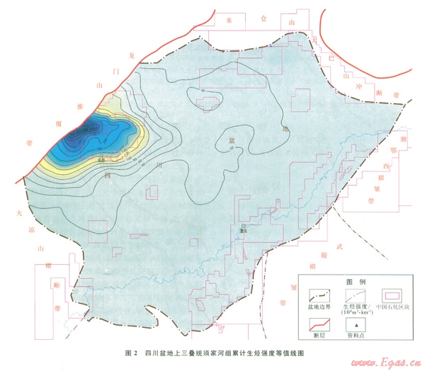 須家河組暗色泥質(zhì)烴源巖主要發(fā)育于須一段、須三段、須五段,生烴中心在川西坳陷中段(圖2),其生烴強(qiáng)度最大,為100×108~300×lO
