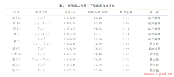 新場氣田須二段氣藏中下亞段共有11個測試數(shù)據(jù),計算的地層壓力如表2所示。從表2中可以看出,壓力系數(shù)在1.42~1.70之間一個較大范圍內(nèi)變化,總體表現(xiàn)出不同目標(biāo)區(qū)(或裂縫體系)壓力系數(shù)不同,如中部裂縫體系壓力系數(shù)高(新851井須二4亞段壓力系數(shù)l.66,新853井壓力系數(shù)1.70),而該裂縫體系以西地區(qū)壓力系數(shù)大幅度降低(新3井壓力系數(shù)1.44、新301井壓力系數(shù)1.50),氣藏東部裂縫體系壓力系數(shù)較低(新5井壓力系數(shù)1.52,新501井壓力系數(shù)1.53),充分說明氣藏?zé)o統(tǒng)一的壓力系統(tǒng)。