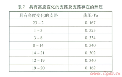 由圖2可知,共有7個支路具有高度變化(見表2),因此在這7個支路上存在熱壓,計(jì)算結(jié)果見表2。