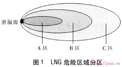 LNG蒸發(fā)達(dá)到一定濃度時(shí),可能危及人的生命安全,遇到明火,甚至?xí)a(chǎn)生爆炸。本評(píng)價(jià)根據(jù)LNG蒸氣擴(kuò)散到不同濃度時(shí)造成危害程度的大小,將LNG擴(kuò)散的危險(xiǎn)區(qū)域劃分為3個(gè)區(qū)。爆炸危險(xiǎn)區(qū)(A區(qū)):LNG蒸氣濃度高于爆炸下限,遇明火產(chǎn)生爆炸;嚴(yán)重?fù)p害區(qū)(B區(qū)):LNG蒸氣濃度較高,可能造成人員急性中毒甚至死亡;輕度損害區(qū)(C區(qū)):LNG蒸氣濃度可引起人員不良反應(yīng),造成輕度中毒或吸入反應(yīng)。3個(gè)區(qū)域的關(guān)系見(jiàn)圖1。