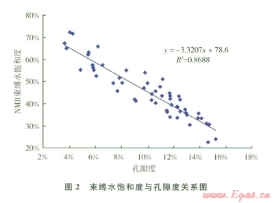 常規(guī)測井解釋可動水飽和度的原理如下:①根據(jù)核磁共振技術(shù)標(biāo)定巖樣束縛水飽和度(原始含水飽和度減去可動水飽和度)與孔隙度之間的關(guān)系(圖2);②在各個深度點,根據(jù)常規(guī)測井解釋出的孔隙度計算出束縛水飽和度;③將常規(guī)測井解釋出的原始含水飽和度減去束縛水飽和度,得到該深度儲層的可動水飽和度,從而繪制出可動水飽和度縱向分布曲線。