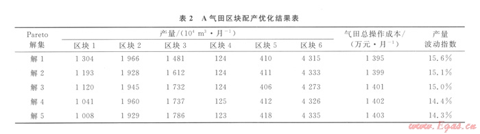 表2給出模型的Pareto解集,該解集包含5個Pareto解,這5個解滿足約束條件,總操作成本介于1 395~1 403萬元/月,產(chǎn)量波動指數(shù)在14.3~15.6范圍內(nèi),均優(yōu)于按同比例增長方案。決策者可以根據(jù)各區(qū)塊實際情況,在上述解中選取一組進(jìn)行調(diào)峰配產(chǎn)。