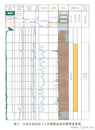 當(dāng)儲(chǔ)層內(nèi)的流體為低礦化度的地層水或淡水時(shí),由于水中呵移動(dòng)的導(dǎo)電離子數(shù)大量減少,從而導(dǎo)致電阻率值增加,在測(cè)井電阻率曲線上則表現(xiàn)出高電阻率特征。由于隨著勘探程度的不斷提高,勘探家們?cè)絹?lái)越認(rèn)識(shí)到淡水地層的電阻率類同氣層,電阻率值較高,因而按常規(guī)解釋易出偏差,這也是HS1井柄霞組水層呈現(xiàn)出高電阻率特征易解釋失誤的原因。K2井棲霞組巖性主要為淺灰-灰色細(xì)-中晶白云巖,粗晶(砂糖狀)白云巖發(fā)育。巖心分析物性表明,孔隙度分布范圍介于0.42%~l 6.61%,孔隙度在各個(gè)區(qū)間分布較為平均,平均孔隙度為3.03%,明顯較HS1井高(圖2),儲(chǔ)層物性特征明顯較致密的HS1井好,屬于中等-好儲(chǔ)層。從K2井儲(chǔ)層測(cè)井解釋看,棲霞組儲(chǔ)層電性特征具有低伽馬值、高電阻率、相對(duì)較高的聲波時(shí)差特征,無(wú)疑具有典型的氣層特征(圖5)。但通過(guò)該井MDT取樣分析卻表明:儲(chǔ)層段產(chǎn)水。根據(jù)本井MDT水樣分析資料,其Cl-含量?jī)H164 mg/L礦化度低,反映儲(chǔ)層中的水為淡水特征。