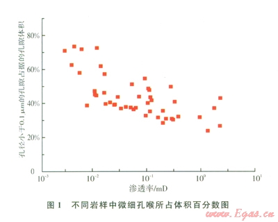 巖樣壓汞測試結果表明,須家河組低滲儲層孔喉細小,微孔喉發(fā)育。儲層滲透率越低,小于0.1 μm的微喉道控制的孔隙體積比例越高(圖1)。對于覆壓滲透率為0.1 mD左有的儲層,由小于0.1 μm的喉道控制的孔隙體積在30%以上,對滲流能力起主要貢獻作用的是0.5~1μm之間的喉道。覆壓滲透率0.01mD左右的儲層,由小于0.1μm的喉道控制的孔隙體積在45%~75%之間,對滲流能力起主要貢獻作用的是0.1~0.5μm之間的喉道。