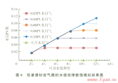 為了進一步研究儲層產水的宏觀機理,開展了兩種氣水狀態(tài)下的物理模擬實驗和數值計算。一種是氣水分異明顯的儲層,一種是氣水互封狀態(tài)下的儲層再,對比分析水封氣狀態(tài)及氣、水能量對儲層產水的影響規(guī)律。結果表明,對于氣水分異明顯的低滲儲層,由于水相彈性膨脹能力小,且儲層滲透率低,儲層產水量很小,而且水體倍數對其影響也很小,對于氣體產能影響不大,可以忽略不計。對于氣水互封的儲層,采氣過程中巖心的水侵量達到了0.2 PV,會嚴重影響氣體產能,可見氣水存在關系對于氣井產水有重要影響。圖6是不同水封氣量下氣井開發(fā)過程中的水侵動態(tài)數值計算結果,發(fā)現水封氣能量越高,儲層越容易產水;隨可動水飽和度增加(對于束縛水飽和度一定的儲層,即原始含水飽和度增加),氣井開發(fā)過程中的水侵量顯著增加,南不含水封氣到0.1 PV水封氣,對應的水侵量由0增加到近0.12 PV,嚴重影響氣井產能。由此可見,低滲儲層產水量主要受到兩方面的宏觀因素控制:一是水封氣能量大小,二是可動水飽和度高低。