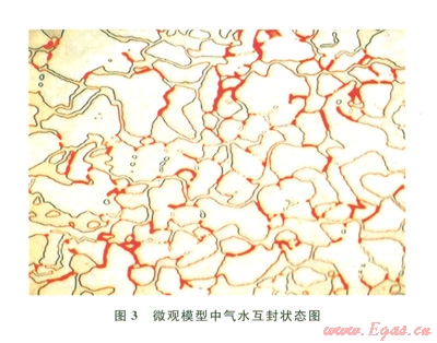 微觀模型含水狀態(tài)下開發(fā)物理模擬實驗表明,對于低滲透砂巖氣藏來講,由于水相一般為潤濕相,主要分布在微細孔喉內及巖石表面,氣體賦存在孔隙內,含水微細孔喉包圍控制孔隙體,形成氣水互封的狀態(tài)(圖3)。開發(fā)過程中,氣相產出要突破孔喉處水相的束縛作用。