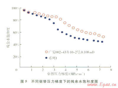 對須家河組2塊低滲透巖樣進行了不同壓力梯度下氣驅飽和水巖樣實驗,在初始高含水飽和度階段,隨著驅替壓力梯度的增大,殘余水飽和度降低緩慢,主要是由于氣相飽和度小于20%,不能產生連續(xù)氣相運移。隨著驅替壓力梯度的進一步增大,氣相飽和度逐步增加,達到臨界含氣飽和度20%后,形成連續(xù)運移,這時氣相運移進入大喉道及其控制的孔隙中,使得含水飽和度快速降低。當含水飽和度降低到50%后,氣相進入更細小的喉道及孔隙的難度加大,驅替壓力梯度的增加導致含水飽和度緩慢降低(圖5)。須家河組低滲透砂巖氣藏儲層含水飽和度在40%~60%之間,高于束縛水飽和度,存在0~20%的可動水飽和度。驅替壓力梯度越大,水相越容易動用。