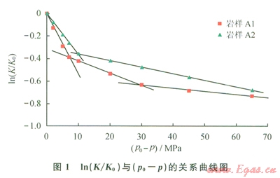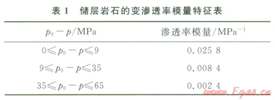 采用擬三軸應(yīng)力巖心夾持器測(cè)定該井取樣巖心在不同有效應(yīng)力下的滲透率,發(fā)現(xiàn)在儲(chǔ)層壓力范圍為0~65MPa時(shí),表現(xiàn)為變滲透率模量特征,研究發(fā)現(xiàn)可以用3段滲透率模量來(lái)表征滲透率隨有效應(yīng)力變化的關(guān)系(表1)。