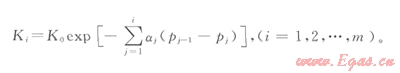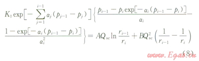 在Pi≤P≤i-1內(nèi)(其對(duì)應(yīng)的徑向距離ri≤r≤ri-1),儲(chǔ)層滲透率可以表示為: