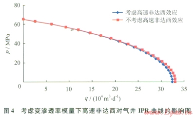 圖4為考慮變滲透率模量下高速非達(dá)西對(duì)氣井IPR曲線的影響,從圖中可以看到高速非達(dá)西效應(yīng)將會(huì)使異常高壓氣藏氣井的產(chǎn)量降低,并且隨著井底流壓的減小,高速非達(dá)兩效應(yīng)使得氣井產(chǎn)量降低得更嚴(yán)重。
