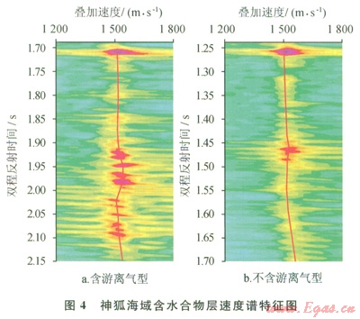 圖4為神狐海域含水合物層的速度譜。速度譜中紅線代表拾取的疊加速度。圖4左邊為含游離氣型譜特征,在1.90~1.98s段,疊加速度增加明顯,速度值從1520m/s增加到1550m/s,至l.98~2.02s段,疊加速度突然下降到1500 m/s,下降幅度較大,即水合物下地層比水合物上地層疊加速度要低。圖4右邊為不含游離氣型譜特征,在1.43~1.46s的水合物段疊加速度有一明顯的增加過程,到l.46~1.48s段,疊加速度有所下降,但下降幅度較小,即水合物下地層比水合物上地層疊加速度要高,無明顯的游離氣存在特征。