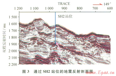 圖3是神狐海域過SH2站位的地震反射剖面,從圖3中可看出,沉積物波表現(xiàn)為席狀波狀相,整體呈長條形或伸長狀席狀外形,厚度較為均一,內(nèi)部同相軸呈不對稱波狀反射結(jié)構(gòu),向上坡方向遷移攀升;在橫切大陸坡的剖面上,呈連續(xù)的波狀或丘狀;其底部有明顯的滑脫面,這是由于底流發(fā)育時具有較強的侵蝕能力,對早期的沉積物進行了簸選改造和再沉積,頻繁的侵蝕界面可能反映r底流的脈動性。剖面上TRACE900~TRACEl 000,BSR之上有一明顯的因速度振幅異常而形成的眼球狀結(jié)構(gòu),是一條比較典型的含水合物層特征的地震剖面。另外,BSR上面有明顯的、連續(xù)性較好的振幅空白帶,極性與海底極性相反。
