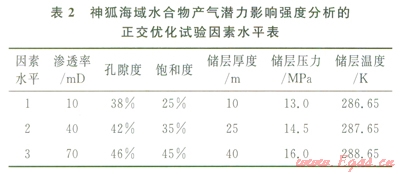 水合物藏產(chǎn)氣潛力的地質(zhì)評價(jià)參數(shù)是指對水合物產(chǎn)氣效率產(chǎn)生影響的沉積地質(zhì)要素,地質(zhì)評價(jià)參數(shù)的正確選擇是產(chǎn)氣潛力評價(jià)的關(guān)鍵。首先,通過綜合特定海域水合物區(qū)的地質(zhì)、地球物理、鉆探數(shù)據(jù)等資料,研究巖性、巖相展布規(guī)律、水合物的賦存狀態(tài)和地質(zhì)條件、水合物產(chǎn)m特征和儲(chǔ)層類型,定性和定量分析影響水合物分解和產(chǎn)氣潛力的各項(xiàng)要素,如巖性、溫壓條件、沉積體孔隙度、水合物飽和度、滲透率、儲(chǔ)層厚度、孔隙水鹽度等;然后,數(shù)值分析地質(zhì)參數(shù)對水合物產(chǎn)能的影響強(qiáng)度和敏感性,利用正交優(yōu)化試驗(yàn)方法對地質(zhì)參數(shù)的影響強(qiáng)度進(jìn)行排序,如表l中南海北部神狐海域3個(gè)站位上的水合物產(chǎn)出特征的地質(zhì)參數(shù),可構(gòu)建如表2所示的正交優(yōu)化試驗(yàn)因素水平表,通過選用合適的正交表即可實(shí)現(xiàn)對地質(zhì)參數(shù)的優(yōu)化和排序;選擇對水合物藏產(chǎn)氣潛力影響較為顯著的地質(zhì)參數(shù),舍棄影響較小、敏感性差的地質(zhì)參數(shù)。