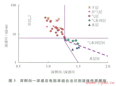 水層則表現(xiàn)為深感應(yīng)電阻率明顯低于深側(cè)向電阻率數(shù)值的特征。其原因是由于淡水鉆井液濾液的侵入導(dǎo)致探測(cè)深度較淺的側(cè)向測(cè)井受高阻沖洗帶的影響更大。而水層由于含高礦化度地層水,其電阻率非常低,深感應(yīng)測(cè)井主要反映原狀地層的低電阻率特征。因此,水層的第二個(gè)特征是深感應(yīng)電阻率比較低,而且儲(chǔ)層的孔隙度愈高、其電阻率數(shù)值愈低。因此在測(cè)井資料質(zhì)量可靠的前提下,根據(jù)試油成果,建立了深側(cè)向與深感應(yīng)電阻率比值法氣水識(shí)別圖版(圖3),氣層深側(cè)向/深感應(yīng)比值介于l~1.3,深感應(yīng)測(cè)量值大于7W·m;水層深側(cè)向/深感應(yīng)比值大于l.3,深感應(yīng)測(cè)量值小于4W·m;其間為氣水同層過渡區(qū)。
