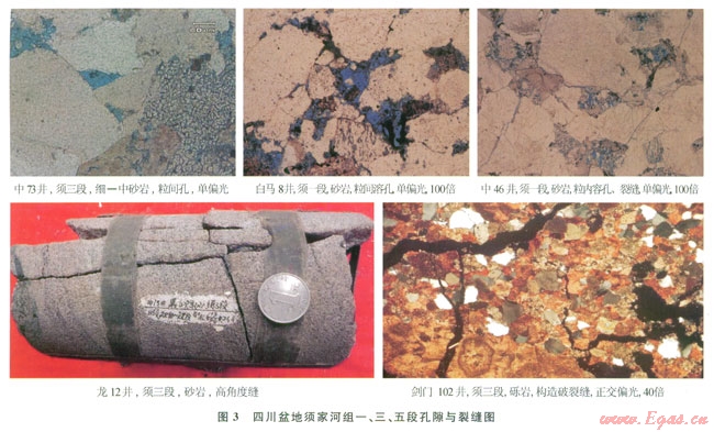 須三段儲集巖有砂巖、礫巖2種類型。砂巖儲層幾乎在全盆地均有分布,儲層孔隙度平均為4.43%,平均滲透率為0.25mD。以中壩地區(qū)物性最好,儲集巖主要為中粒巖屑石英砂巖、長石石英砂巖及巖屑砂巖,巖心平均孔隙度達(dá)7.52%,平均滲透率為0.3mD,粒間溶孔和粒內(nèi)溶孔發(fā)育。礫巖儲層僅分布在川西北劍閣地區(qū),礫石成分以碳酸鹽巖為主,礫間充填砂質(zhì),孔隙主要發(fā)育于基質(zhì)砂巖,孔隙度較低,主要分布在2%~4%。巖心與薄片觀察,裂縫發(fā)育,有時(shí)呈組出現(xiàn)或呈網(wǎng)狀,發(fā)育的裂縫溝通了低孔隙度礫巖儲層,改善了儲層的滲透性,孔隙與裂縫組成礫巖儲層儲集空間,形成“有效儲滲體” [15]。目前該區(qū)勘探發(fā)現(xiàn)多口工業(yè)氣井,表明孔隙度為2%~4%的砂礫巖,只要有裂縫的溝通,仍然可以形成有效儲層。平面上,儲層主要分布在川西地區(qū),以川西北劍閣—中壩地區(qū)最為發(fā)育,儲層厚度超過15m。