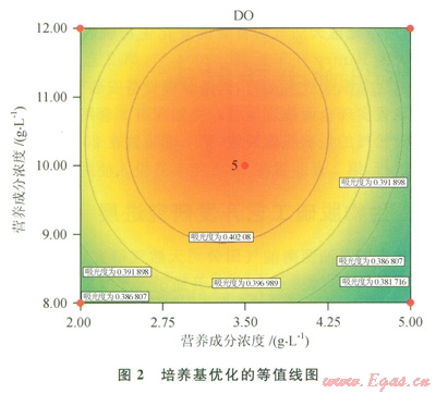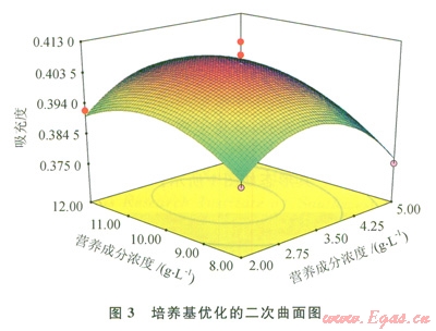 利用計(jì)算機(jī)輔助設(shè)汁,采用表面響應(yīng)法快速篩選微生物能夠利用的營養(yǎng)成分,確定脫硫微生物的所需的營養(yǎng)物種類;采用中心組合設(shè)計(jì)方法優(yōu)化培養(yǎng)基中主要化學(xué)品的組成(圖2、3)。利用Design Expert軟件篩選顯著變量,建立回歸方程,由回歸方程對(duì)菌種生長能力進(jìn)行預(yù)測(cè),并得到最優(yōu)培養(yǎng)基組成。同時(shí)應(yīng)用單因素實(shí)驗(yàn)篩選生長因子及微量元素,形成了完整的培養(yǎng)基配方。