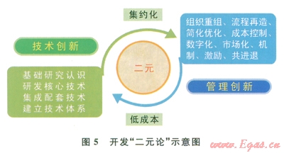 “二元論”是從我國鄂爾多斯盆地非常規(guī)油氣勘探開發(fā)實(shí)踐中總結(jié)形成的成功做法,是指在頁巖氣開發(fā)建設(shè)和技術(shù)攻關(guān)中,技術(shù)創(chuàng)新與管理創(chuàng)新相互結(jié)合,集中配置人力、物力、投資、組織等要素,通過集成與集約,以較低的成本實(shí)現(xiàn)開發(fā)目標(biāo)(圖5)。