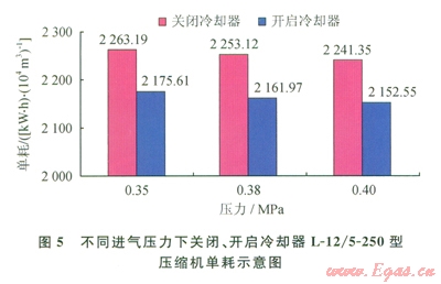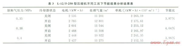 2)結(jié)合現(xiàn)場條件,對L-12/5-250型壓縮機第二、四級級間回氣管上加裝冷卻器后,在0.35、0.38、0.40Mpa,3種進氣壓力下取得的對應(yīng)節(jié)能比分別為3.87%、4.04%、3.96%,驗證了該節(jié)能技術(shù)的可行性。