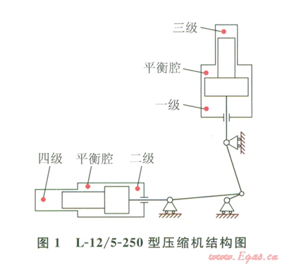 CNG加氣站一般由天然氣預(yù)處理、壓縮、儲存、控制以及CNG售氣等5個系統(tǒng)組成[3]。CNG壓縮機是壓縮系統(tǒng)的核心部分,一般為多級壓縮,采用中間冷卻與分離方式降溫、脫液[4]。某加氣站采用2臺L-1e/5—250型壓縮機,為2列四級壓縮(一、三級在豎直列,二、四級在水平列),中間冷卻,有油潤滑,氣缸和中間冷卻器為水冷結(jié)構(gòu),具有運轉(zhuǎn)平穩(wěn)、排氣量大、適用范圍廣、維護費用低等優(yōu)勢[5-6]。由于采用了級差式壓縮缸結(jié)構(gòu),同列壓縮缸壓力差別較大,氣體作用力差別較大,為了改善活塞桿的受力狀態(tài)和減小電機的負荷,在同列壓縮缸中間設(shè)有平衡腔來平衡活塞力[7]。L-12/5-250型壓縮機結(jié)構(gòu)如圖l所示,其額定功率為126kw,排氣量為12m3/min,進氣壓力為0.5MPa,排氣壓力為25Mpa[8]。
