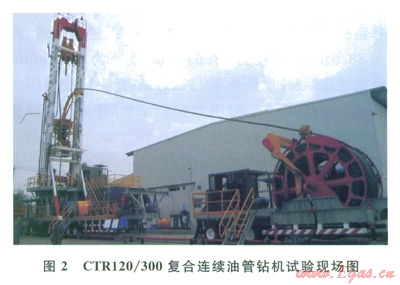2010年,在四川宏華石油設(shè)備有限公司廣漢廠區(qū),對CTRl20/300復(fù)合連續(xù)油管鉆機進行了鉆井試驗(圖2),試驗的目的:①初步掌握連續(xù)油管鉆井工藝;②驗證連續(xù)油管鉆機各部件是否滿足設(shè)計要求,為相關(guān)設(shè)備和零部件的改進提供依據(jù);③考察采用連續(xù)油管鉆井是否能顯著提高鉆井速度;④考察乃Æ88.9mm連續(xù)油管在影Æ215.9mm井眼的鉆進過程中,連續(xù)油管是否能提供相應(yīng)的鉆壓和承受鉆頭的反扭矩;⑤考察連續(xù)油管鉆井過程中井眼的清洗情況。