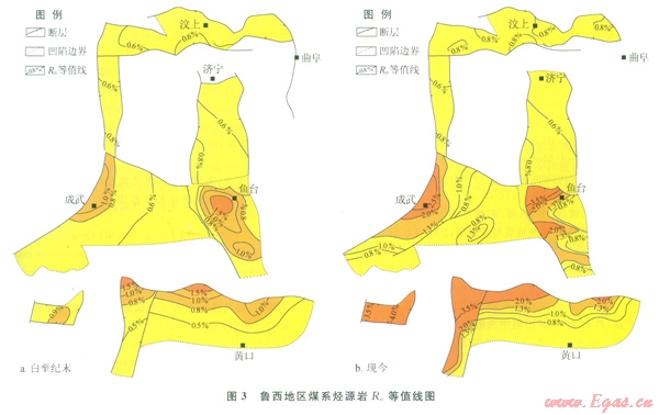 2)各凹陷烴源巖的熱演化過(guò)程有3種類型:濟(jì)寧、巨野凹陷為印支期一次生烴型,生烴能力極差,對(duì)該區(qū)煤成氣成藏貢獻(xiàn)不大;汶上凹陷為印支一喜馬拉雅山期二次生烴型,但僅局部達(dá)到二次生烴條件,生烴潛力有限;黃口、成武、魚臺(tái)等凹陷為印支一燕山期、喜馬拉雅山期二次生烴型,烴源巖大面積成熟,生烴潛力最大。