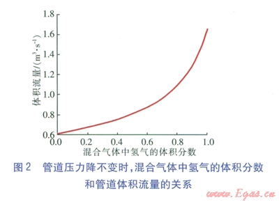 由圖2可知,氫氣加人到天然氣管道后,若保證壓力降不變,則隨著氫氣體積分數(shù)的增大,和輸送天然氣相比,管道的體積流量急劇增大。