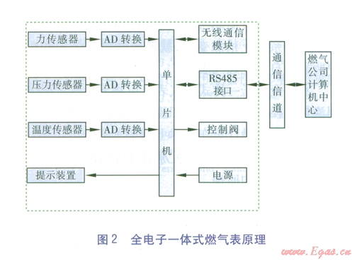 壓力傳感器、溫度傳感器、力傳感器的模擬信號經(jīng)AD轉換后傳給單片機,單片機加以處理后發(fā)送給提示裝置(液晶屏、發(fā)光管和蜂鳴器)以提示用戶,并可向控制閥發(fā)出指令以實現(xiàn)通斷功能。通過通信接口(RS485)將計量數(shù)據(jù)通過通信信道發(fā)送到燃氣公司的計算機中心,或通過無線通信模塊以無線傳輸?shù)姆绞桨l(fā)送到燃氣公司的計算機中心,并接受計算機中心發(fā)出的指令實現(xiàn)控制功能。全電子一體式燃氣表原理見圖2。