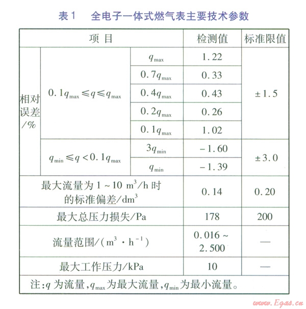 全電子一體式燃氣表通過了無錫市計量測試中心對精確度、重復性、總壓力損失的檢測,取得了校準證書。因目前沒有相應的標準,只能參照膜式燃氣表的標準,其技術指標均達到GB/T6968-2011《膜式燃氣表》1.5級表的要求,主要技術參數(shù)見表l。